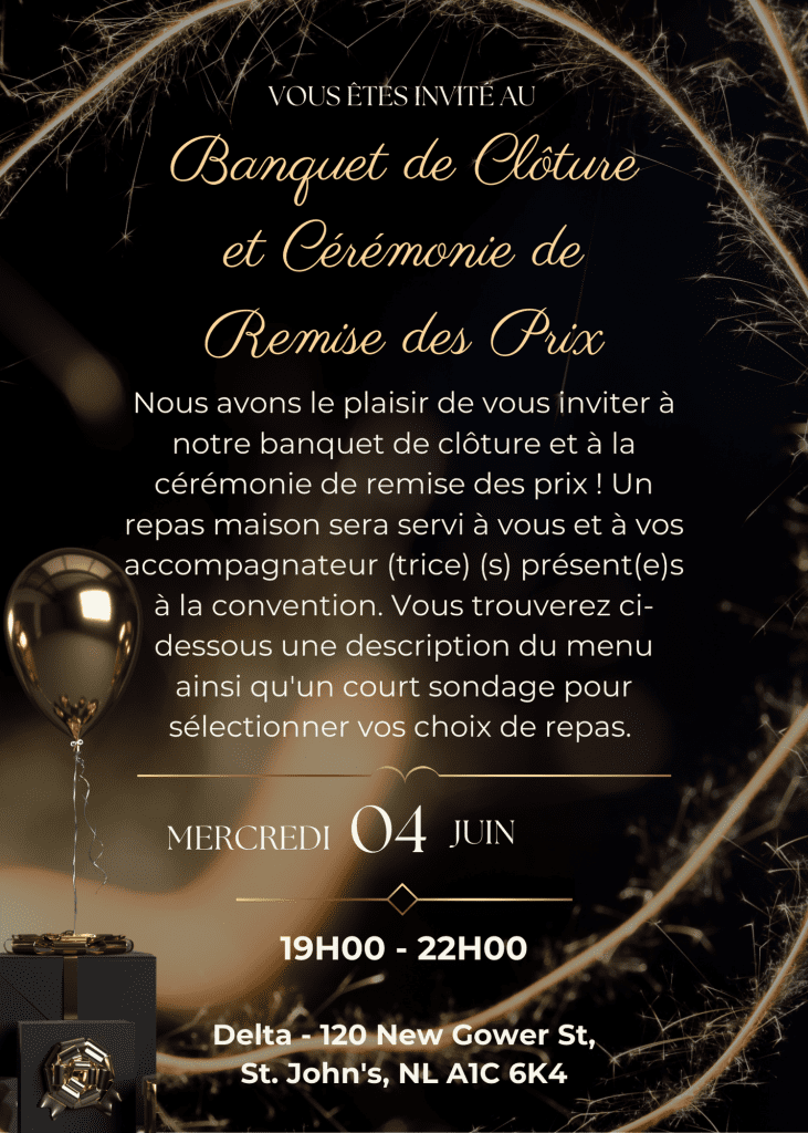 À l’approche de notre convention de juin, nous sommes ravis de vous inviter à prendre part à l’un des moments les plus attendus : notre banquet de clôture et la cérémonie de remise des prix. Nous espérons que vous et votre/vos accompagnateur(trice)(s) avez hâte de célébrer avec nous — et surtout de découvrir les délicieux plats que nous avons préparés pour l’occasion. Ce court formulaire nous permettra de rendre votre expérience agréable, personnalisée et mémorable.
